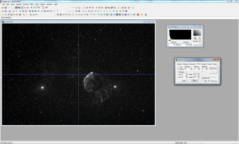 Despite the pointing accuracy of the Paramount it may be that the picture of the subject would look better if it was positioned slightly differently. In Maxim DL I go back into focus mode and set the binning to its maximum (4x4 in the case of the H36 camera I use) and I change to the Ha filter (for this guide), I set the exposure time to 10 seconds and then run continuous exposures and switch the cross hairs on (makes it easier to check a reference point for future sessions on the same subject) see below