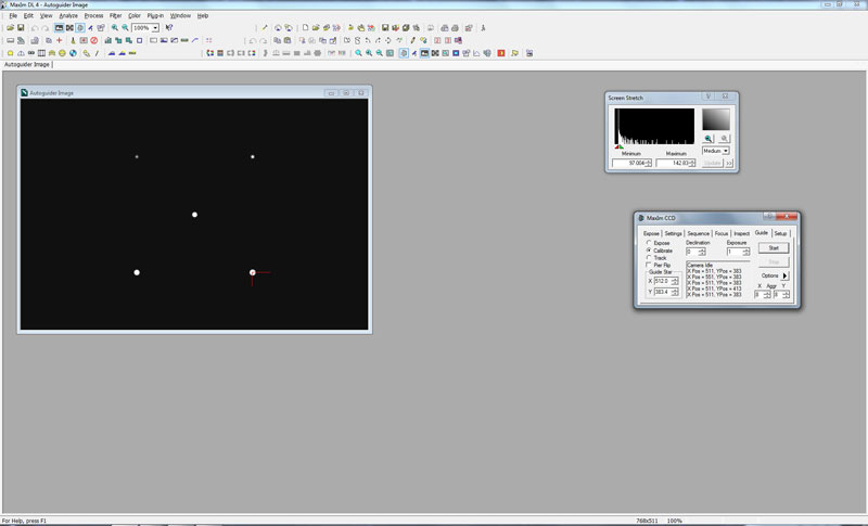 Once an exposure is done I then select a suitably bright star and then click on calibrate, this causes exposures to be taken followed by the mount being moved a certain amount and then back, this is done automatically by Maxim DL. If everything has worked ok a right angled red line will appear on the screen showing where the mount has moved.