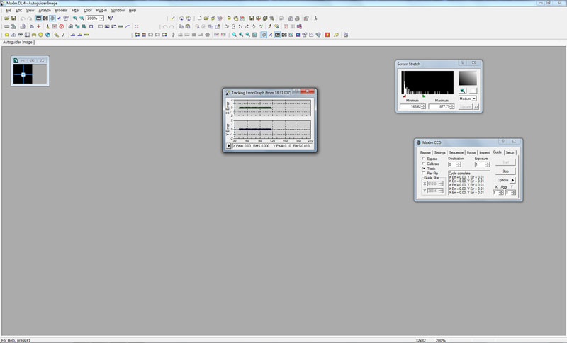 Now it is ok to click on track, the auto guider will now continually take exposures of 10 seconds and make any necessary corrections at which time the screen changes to show a small box with the guide star in, you have the option now to put cross hairs on the box which make any movements/corrections easier to see and you can also open up a guiding graph which show the degree of corrections.